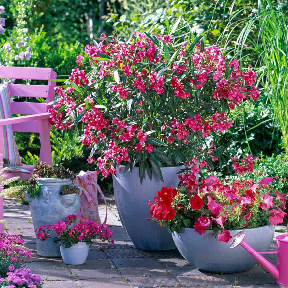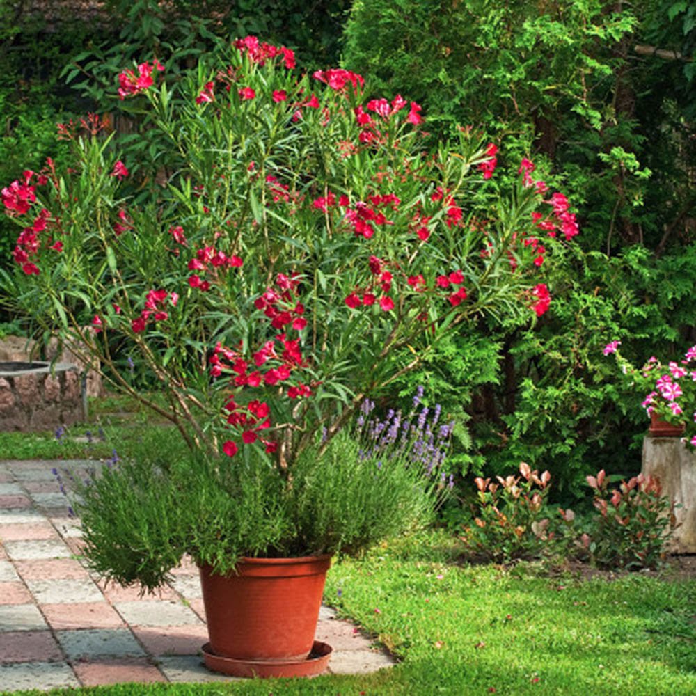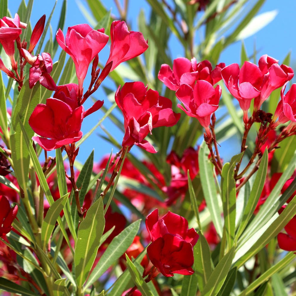 Олеандър (Nerium) храст, с ароматни червени цветове, декоративно растение, привлича пчели, устойчив до -5°C
