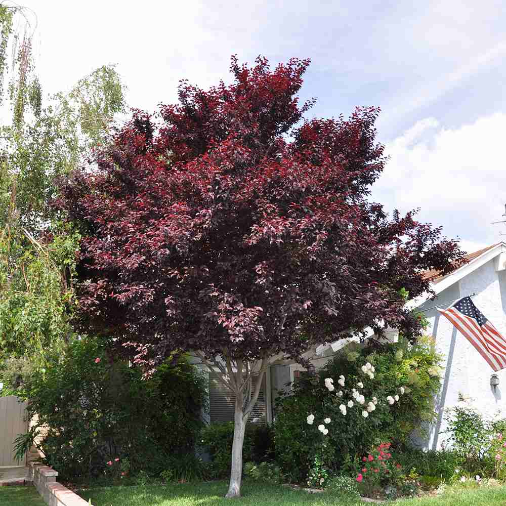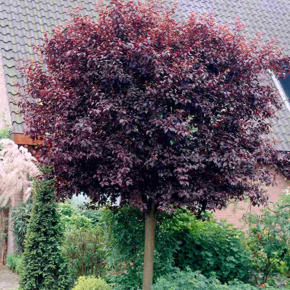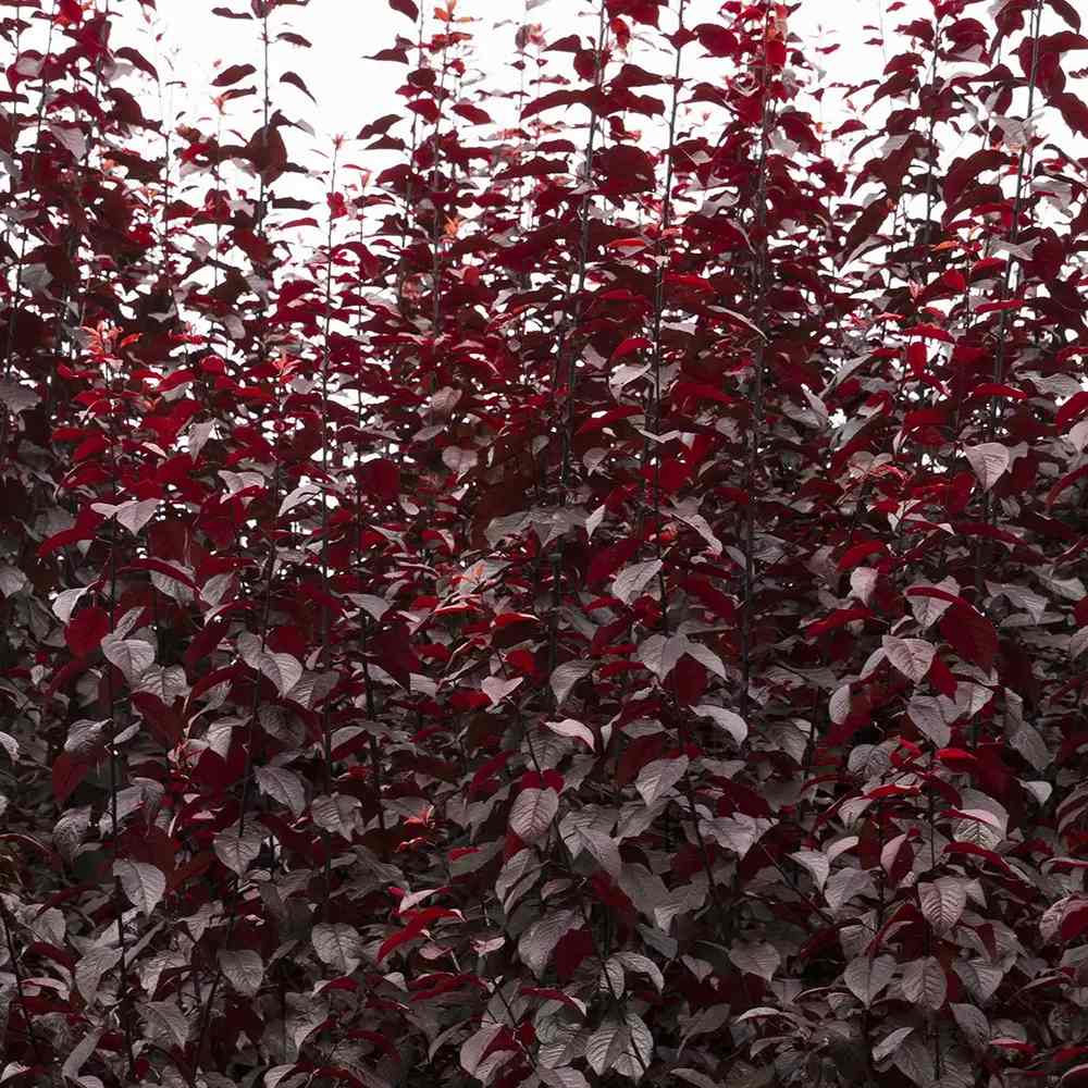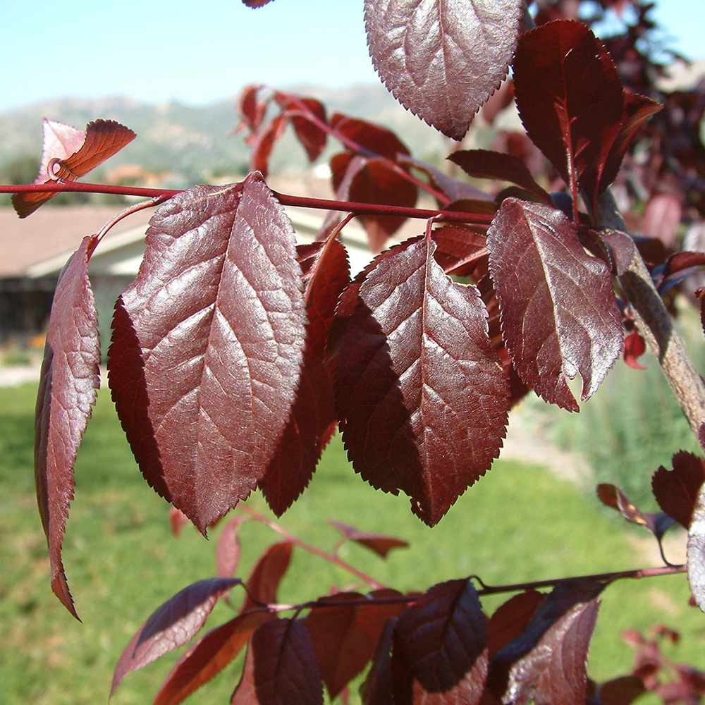 Декоративна слива червенолистна Pissardii, с червени листа и розови цветове