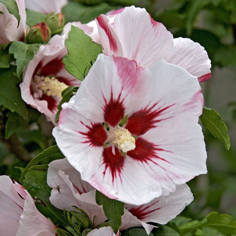 Hibiscus Red Heart, известен още като Hibiscus syriacus, е изключително атрактивно декоративно растение, ценено заради своите големи и впечатляващи цветове. Белите венчелистчета с яркочервено сърце създават елегантен контраст, превръщайки го в истински акцент във всяка градина. Цъфти обилно от юли до септември и е магнит за пчели и пеперуди.