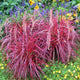 Китайска червена трева Pennisetum Fireworks, пурпурночервена листна маса с кремави ивици, декоративни класове, розово-пурпурни, бърз растеж
