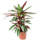 Calathea 'Triostar' е впечатляващо тропическо растение, което променя ориентацията на листата според светлината, създавайки жив и динамичен ефект. Подходяща е за спални, офиси или всекидневни, където ще донесе екзотичен акцент и свежест.