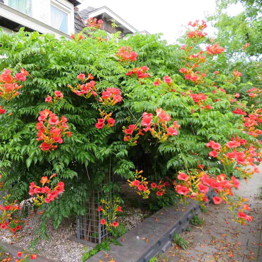 Катерлива тромпета (Campsis) Madame Galen, катерливо растение с сьомгови цветове, бързорастящо