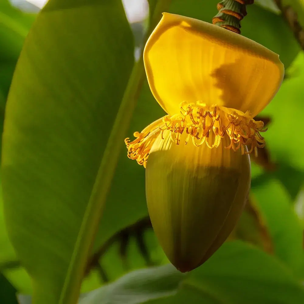 Musa Basjoo, познат още като японски влакнест банан, е едно от най-впечатляващите тропически растения, които може да внесете във вашия дом или градина. С огромните си зелени и лъскави листа, той придава мигновен екзотичен вид и съчетава луксозната визия на бананова палма с изненадваща студоустойчивост. Това е най-устойчивият на студ вид Musa, способен да понесе температури до -10°C, ако корените са добре защитени с мулч. Важно: надземната част измръзва, но напролет израстват нови издънки.