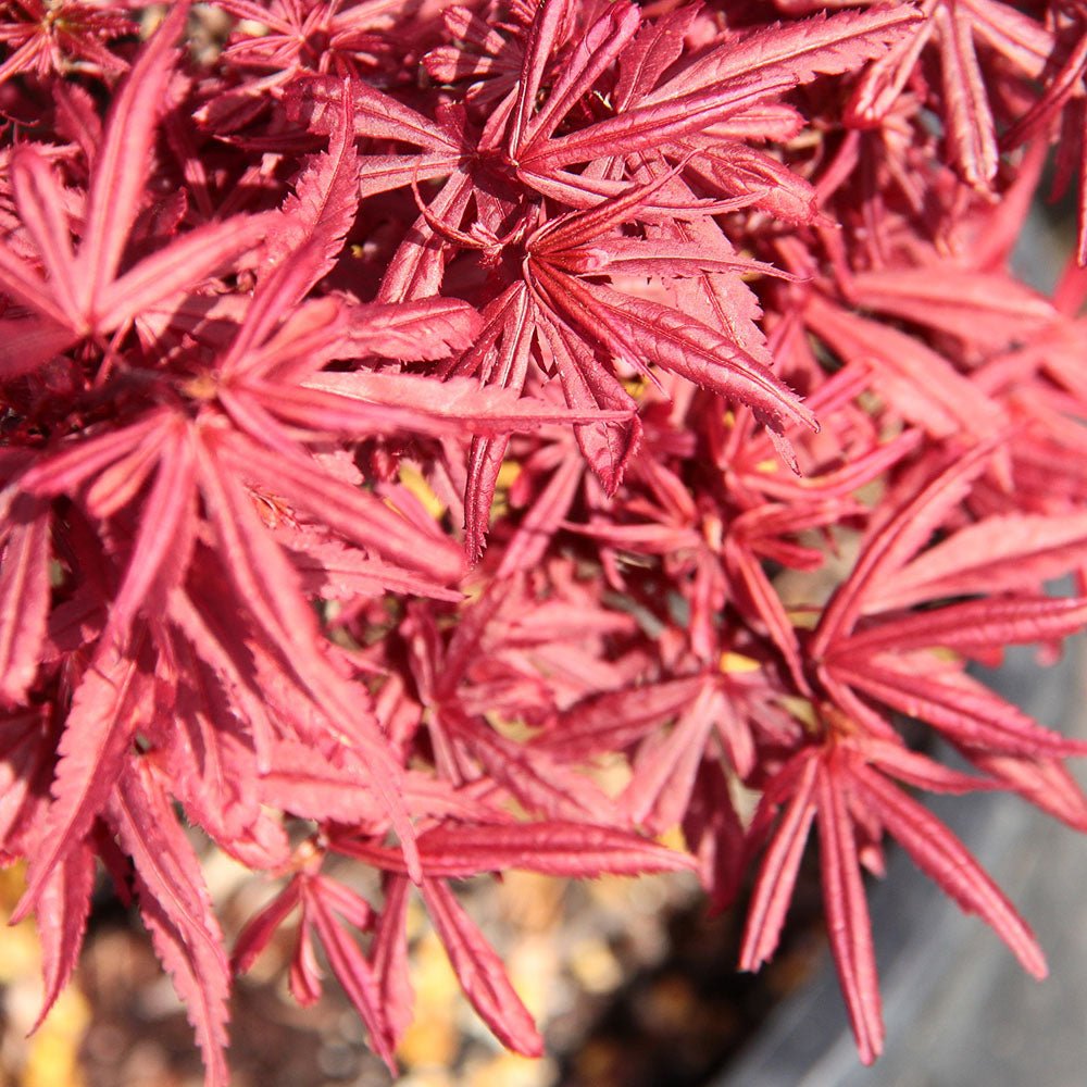 Японски клен джудже червен Shaina, с дантелени червени листа, компактен