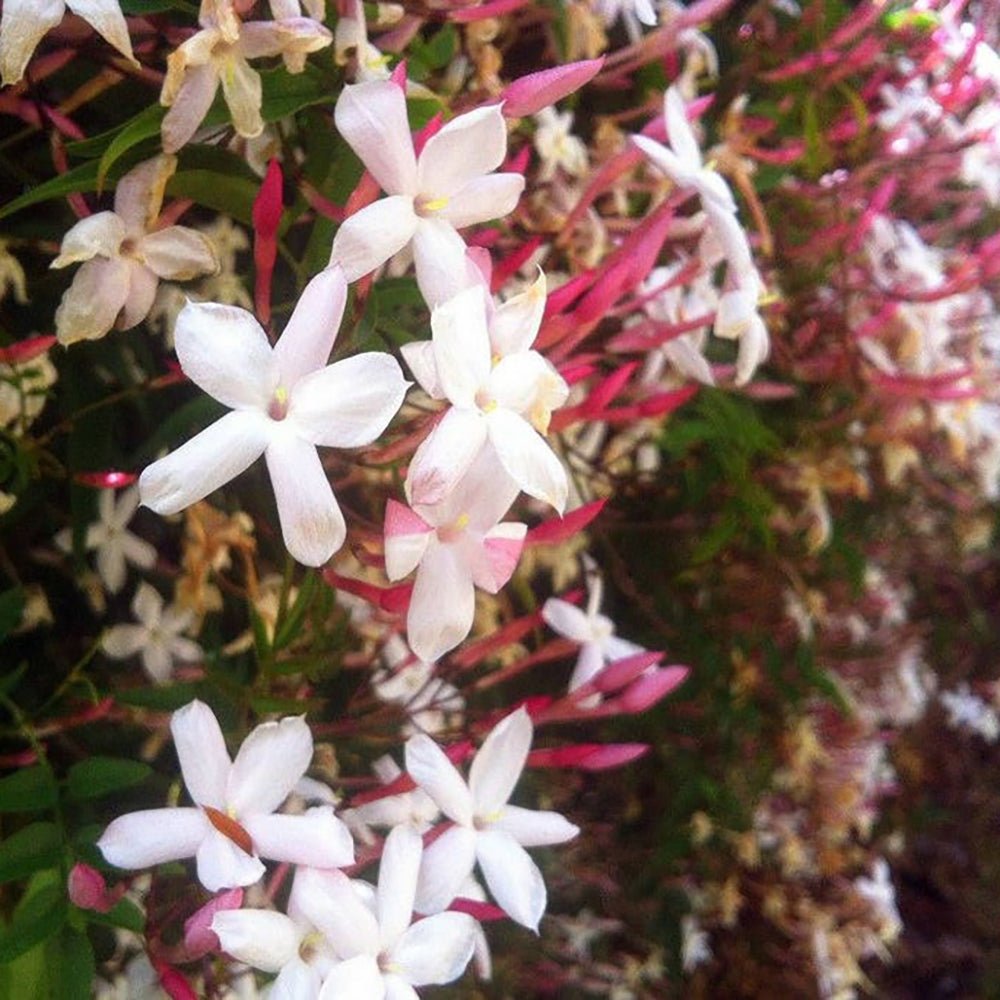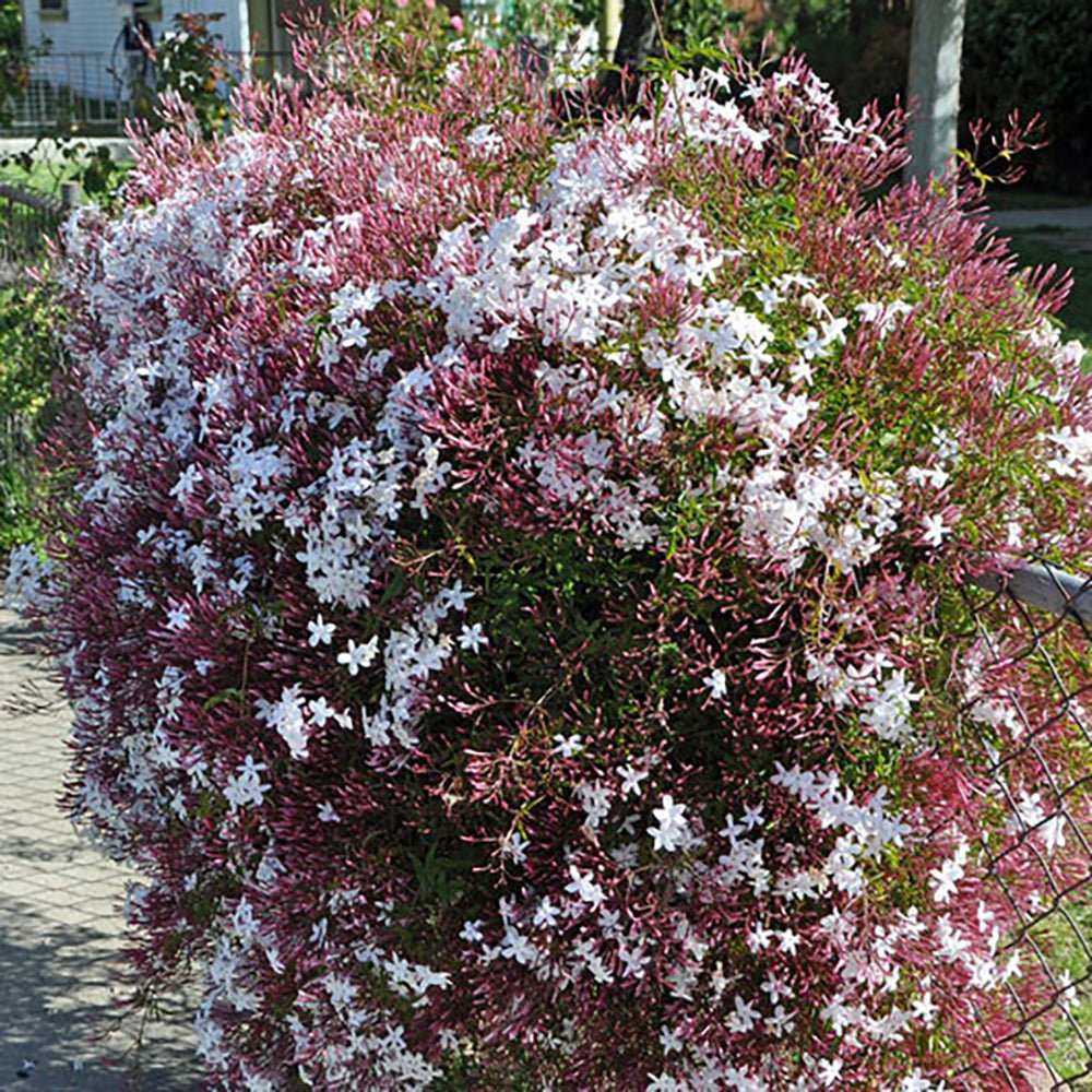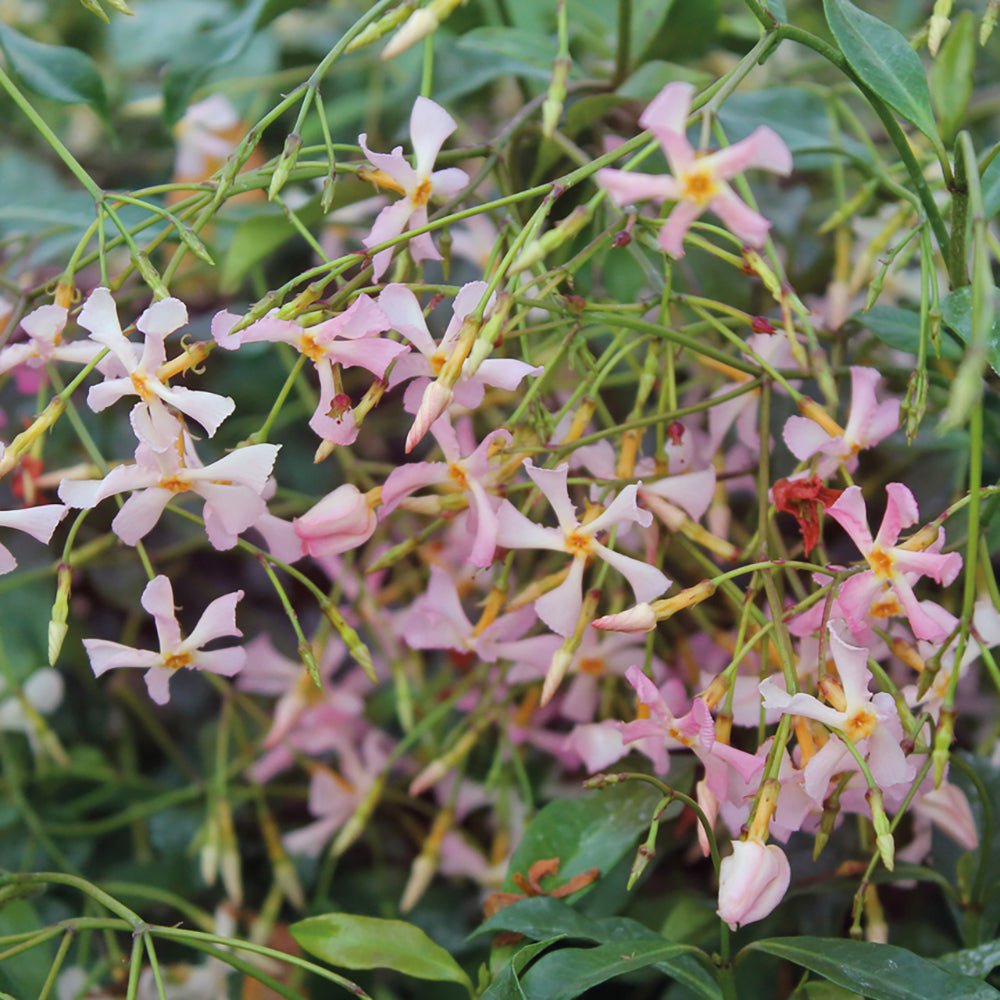 Жасмин звезден Pink Showers, катерлива вечнозелена лиана с розови ароматни цветове, летен цъфтеж, бърз растеж